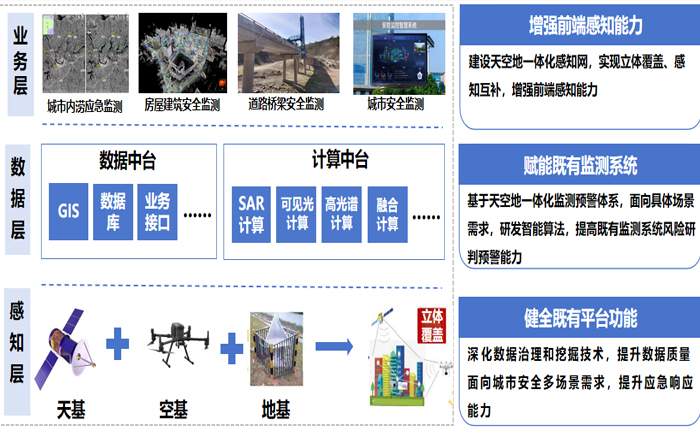 房屋健康監(jiān)測系統(tǒng)建立了天-空-地一體化監(jiān)測預(yù)警體系,天上通過衛(wèi)星遙感宏觀掃描,獲取房屋整體分布等信息;空中利用無人機搭載設(shè)備,近距離巡查屋頂破損等問題;地面靠各類傳感器深入關(guān)鍵結(jié)構(gòu)部位,實時采集物理參數(shù)數(shù)據(jù)。實現(xiàn)“能監(jiān)測、會預(yù)警、快處置”的分級分類治理,保障城市房屋安全。